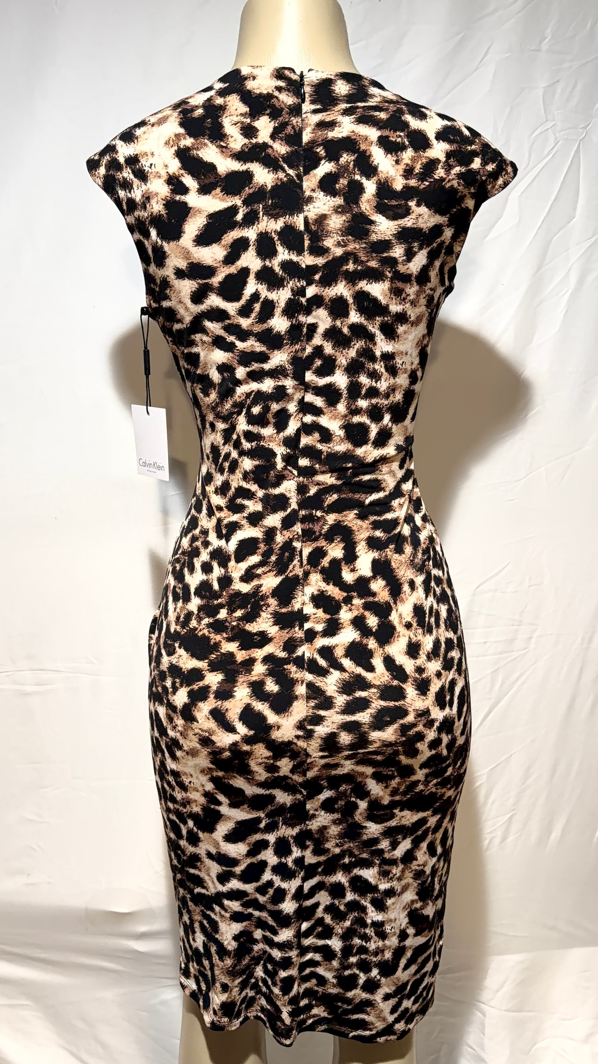 The Calvin Klein dress in size 4 features a sleek sheath style with a V-neckline and sleeveless design, perfect for both party and casual occasions. Made from a blend of polyester and spandex, this multicolor leopard print dress exudes a designer theme with a touch of elegance. The knee-length dress is designed with a zipper closure, making it easy to put on and take off. With its chic accents and brand reputation, this Calvin Klein dress is a versatile and stylish choice for summer, fall, and spring seasons.