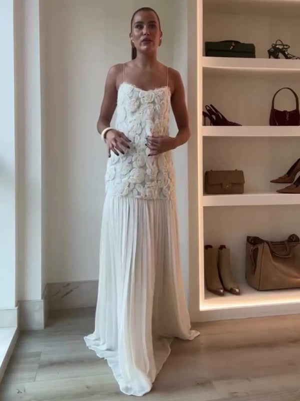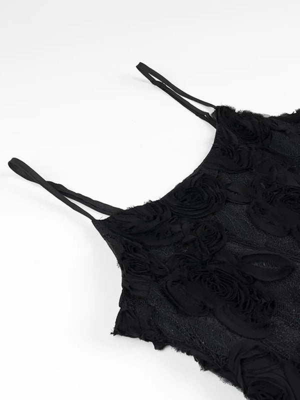 Three-dimensional rose decorated ruffle stitching suspender dress